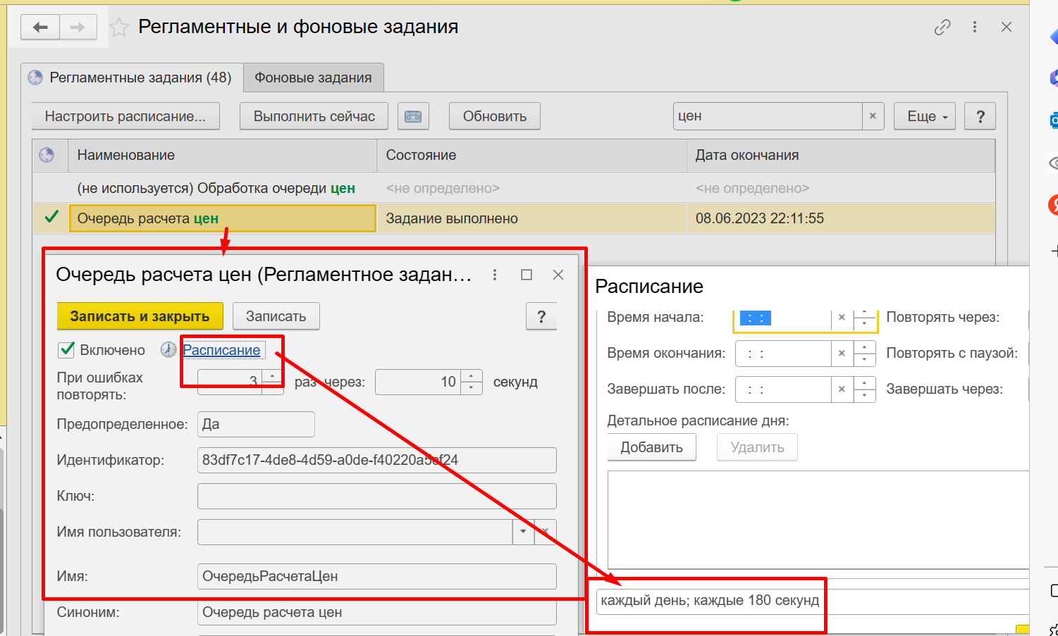Запускаем регламентное задание для расчета цен. Для автоматического расчета можно задать расписание выполнения обработки.