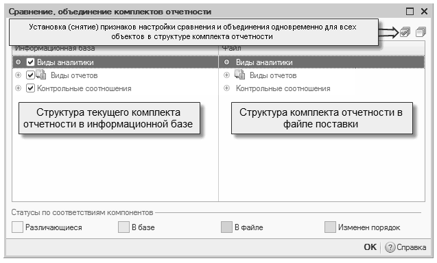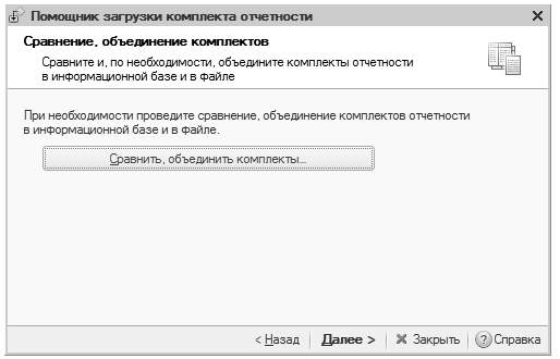 4. Теперь необходимо провести сравнение и, где требуется, объединение по комплектам отчётов. Результирующей данной процедуры будет появление окна «Сравнение, объединение комплектов отчётности 1С», как можно увидеть ниже: