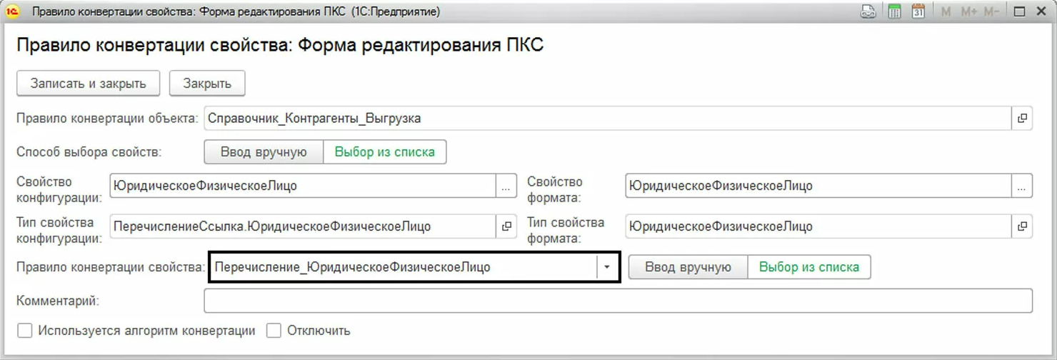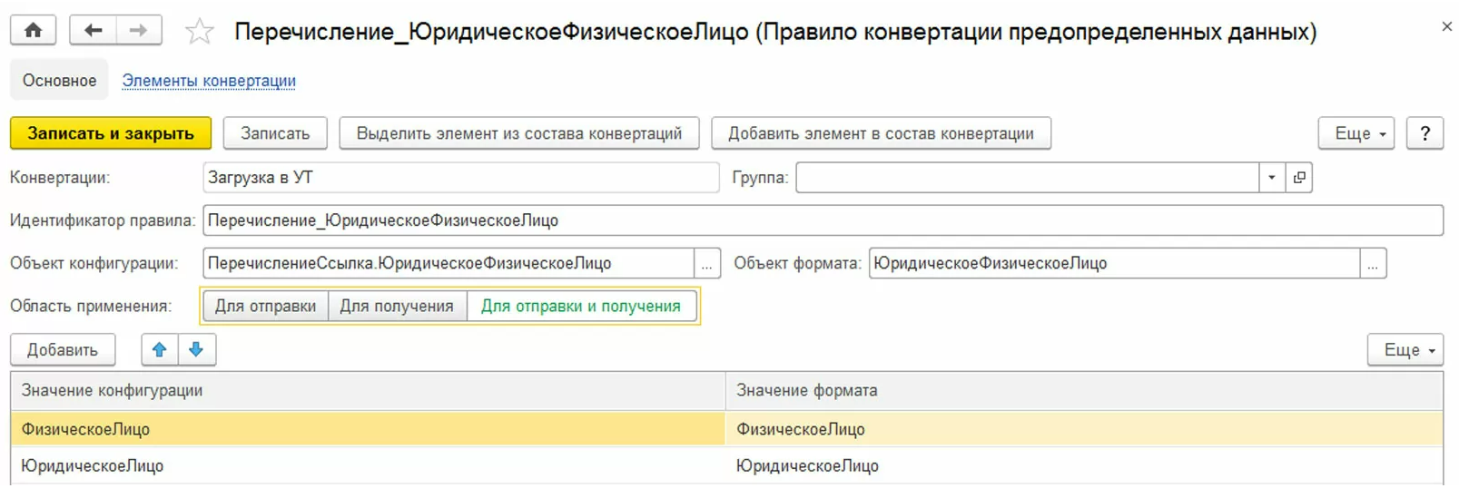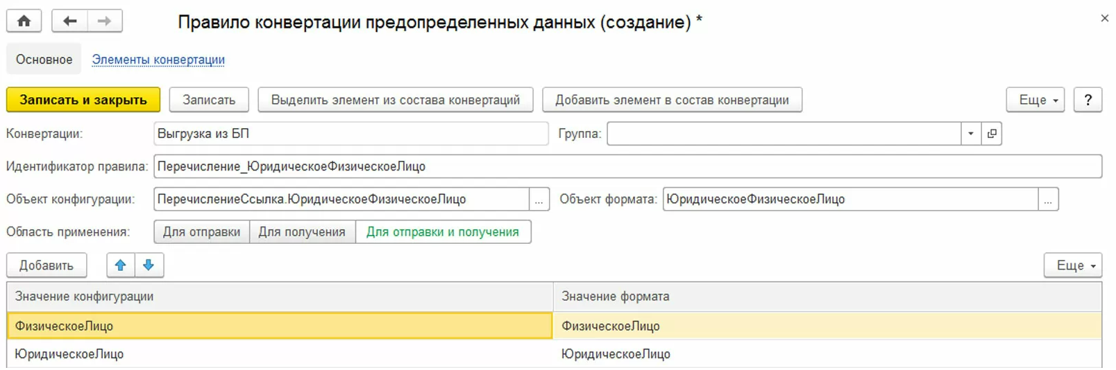 10. Для каждого из правил конвертации данных делаем правило, которое будет касаться данных, которые являются предопределёнными. Областью их использования будет «Для получения и отправки», как демонстрируется ниже: