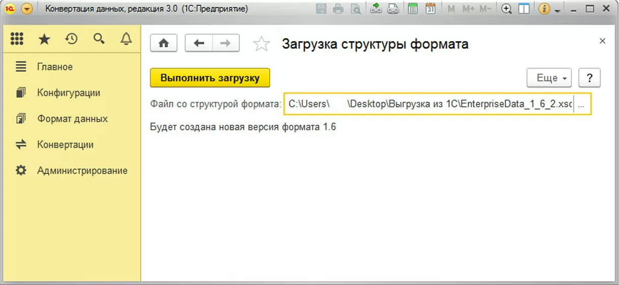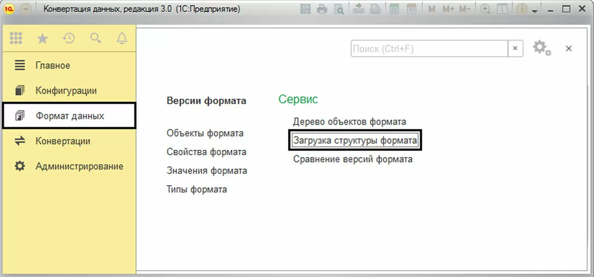 5. Следующий пункт – это загрузить структуру по обменному формату, для этого, открываем вкладку «Формат данных» и кликаем по «Загрузка структуры формата»: