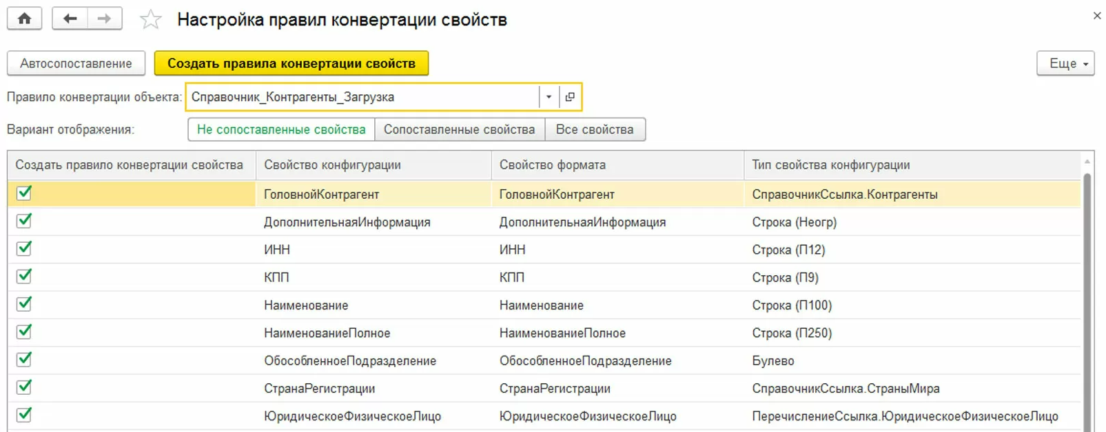 Точно так же кликаем на «Автосопоставление» и выбираем «Создать правила конвертации свойств»: