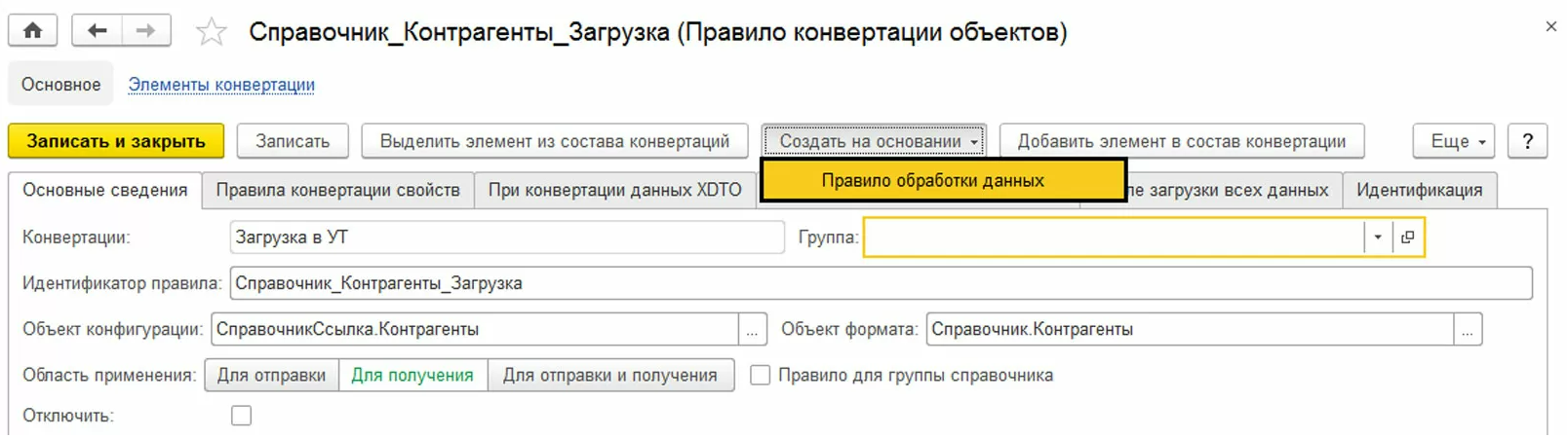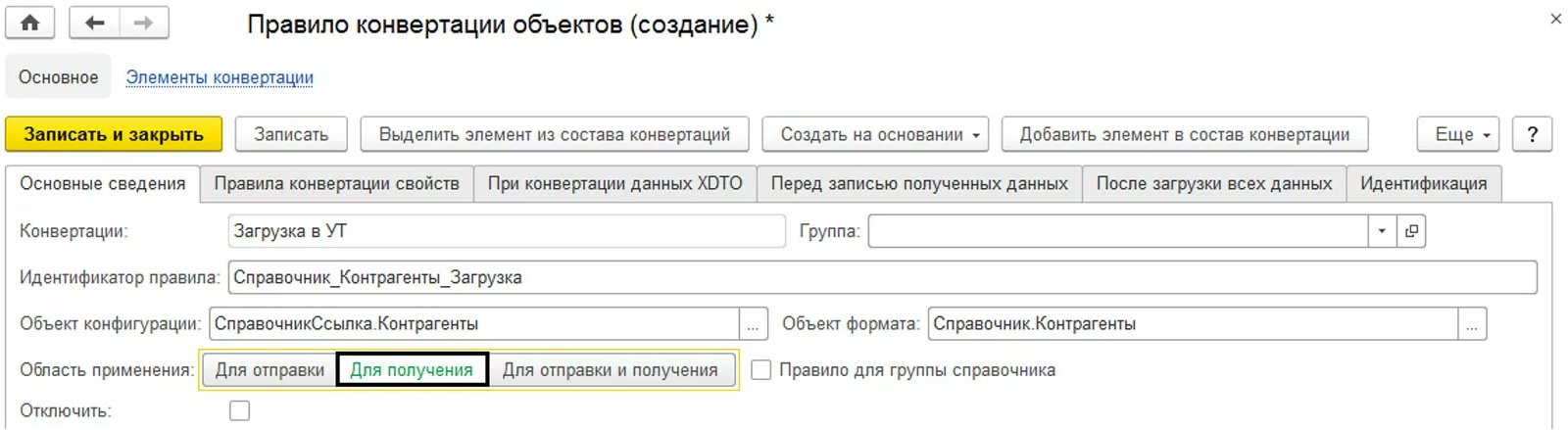 9. Точно так же нужно провести настройку загрузочного правила, внутри конфигурации «1С:УТ», однако, в данном случае, областью использования уже будет «Для получения»: