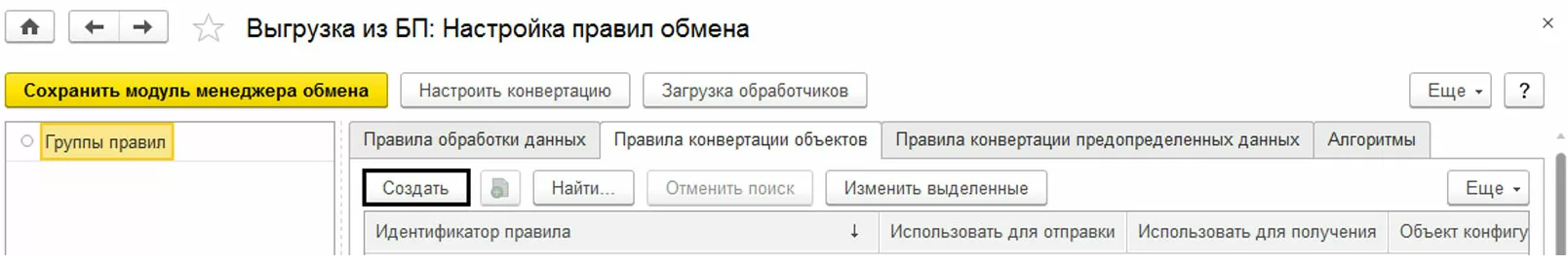 Каждую из операций нужно настраивать отдельно. Переходим на панель «Правила конвертации объектов» и кликаем на «Создать», как демонстрируется в примере ниже: