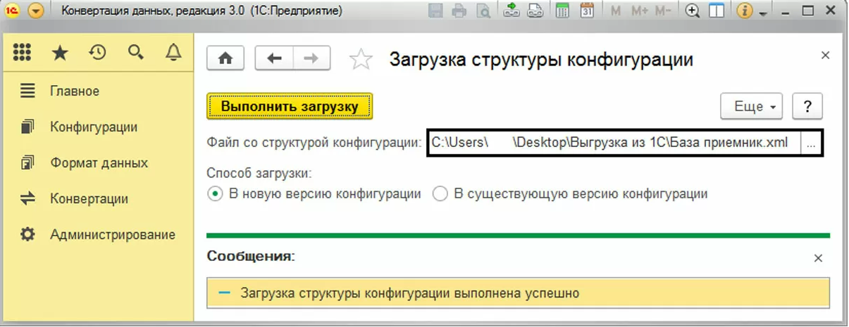 Способом выгрузки избираем «В новую версию конфигурации» и начинаем выполнять загрузку, как демонстрируется ниже: