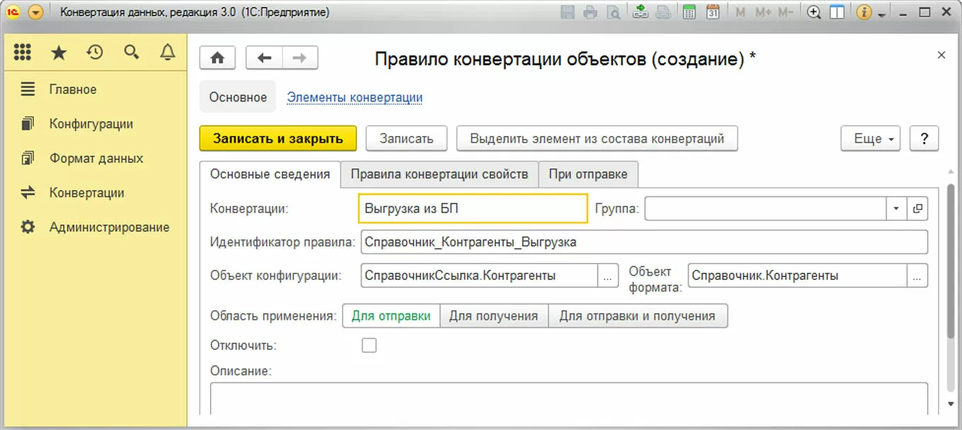 В панели «Основные сведения» нужно прописать отличительную черту правила, а также сам объект и из системы конфигурации 1С, и по формату, а областью использования будет пункт «Для отправки», как можно увидеть ниже: