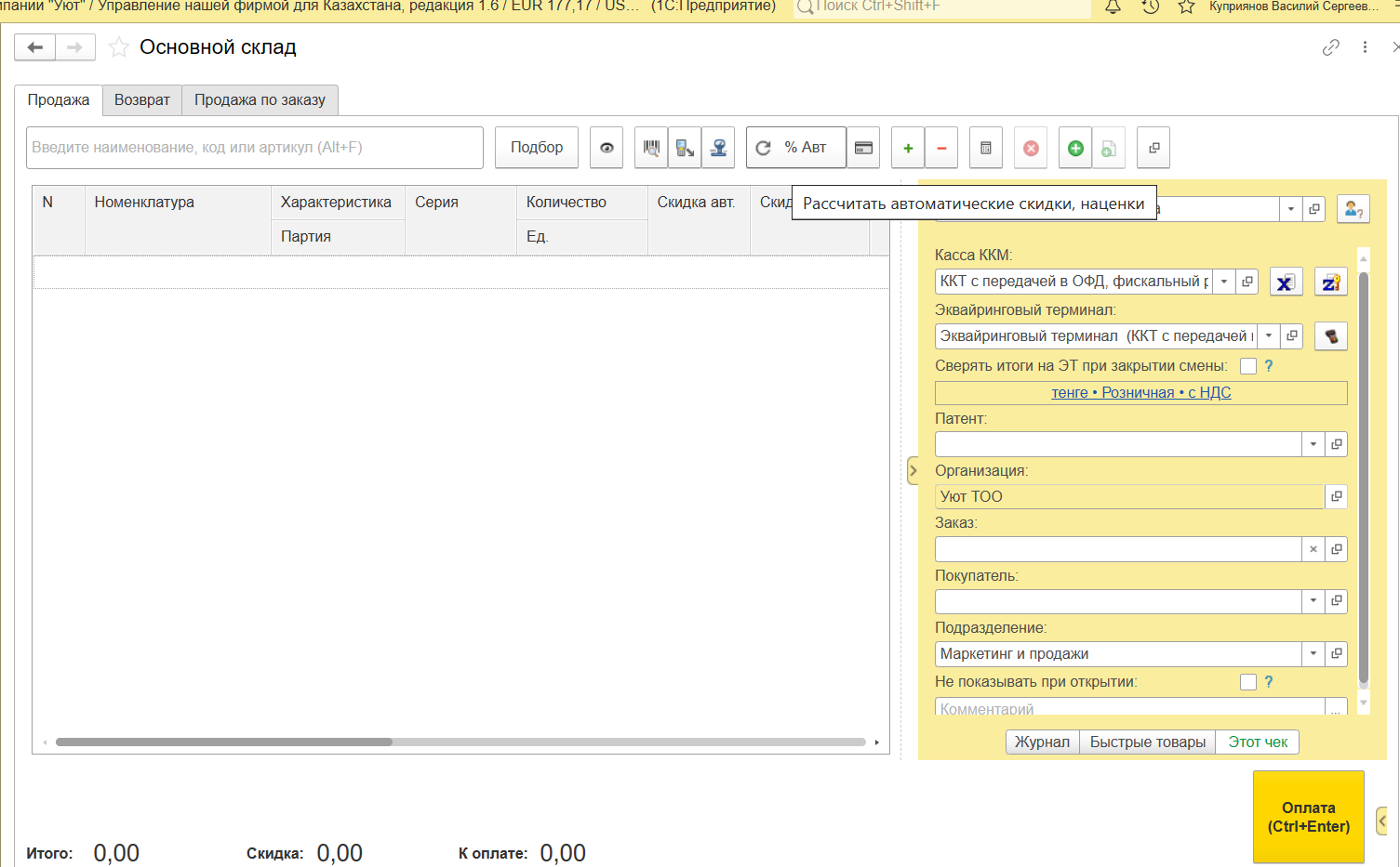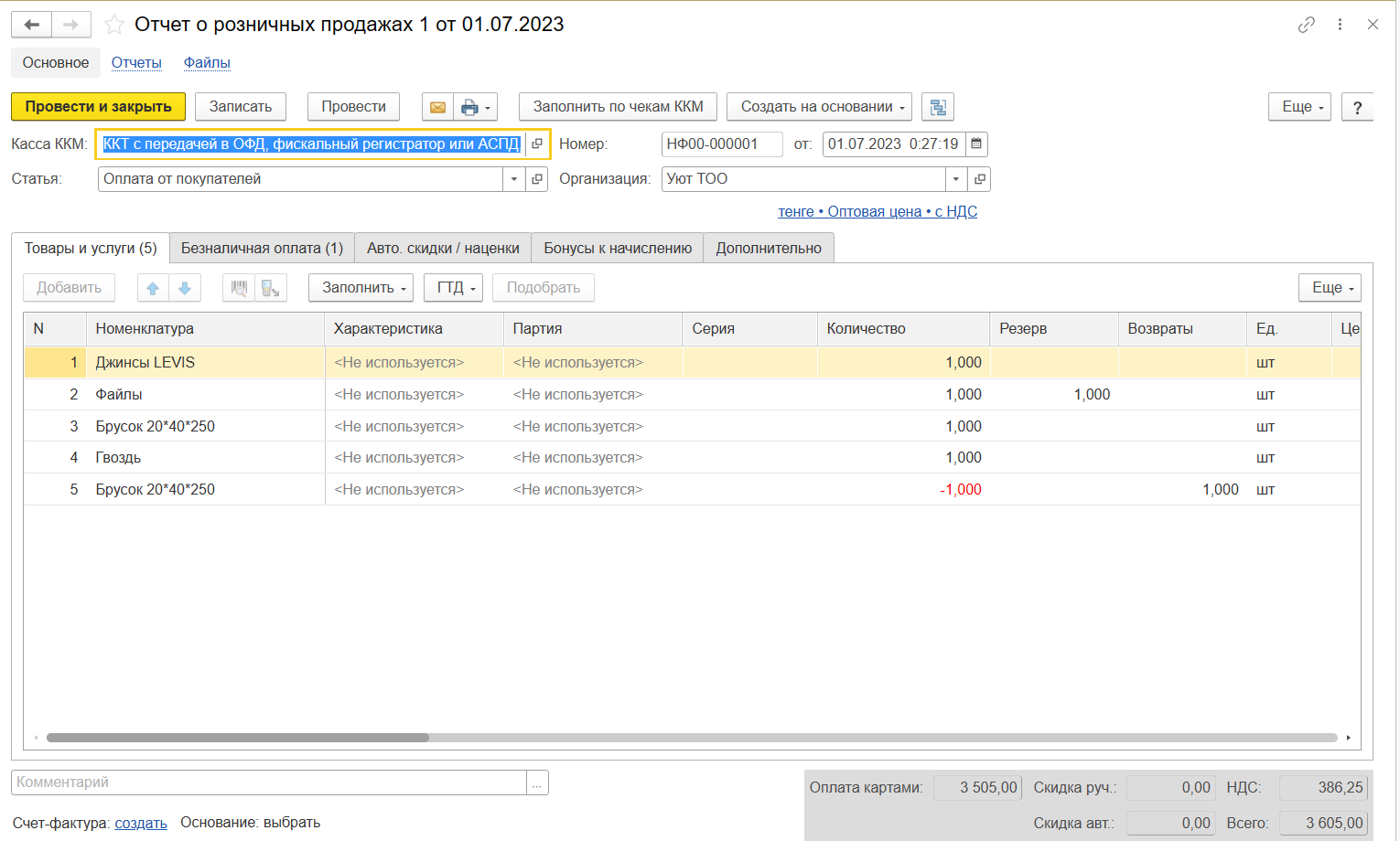 4. Продажа товаров розничной торговли в 1С: УНФ для Казахстана