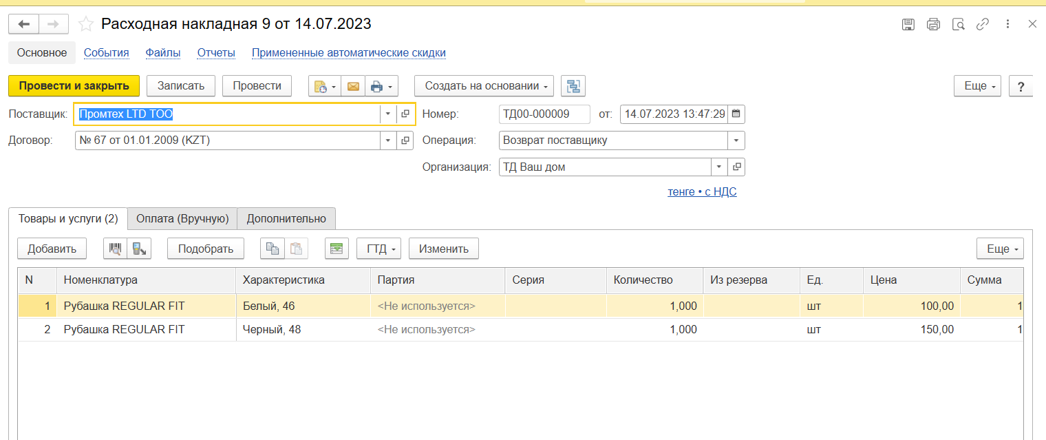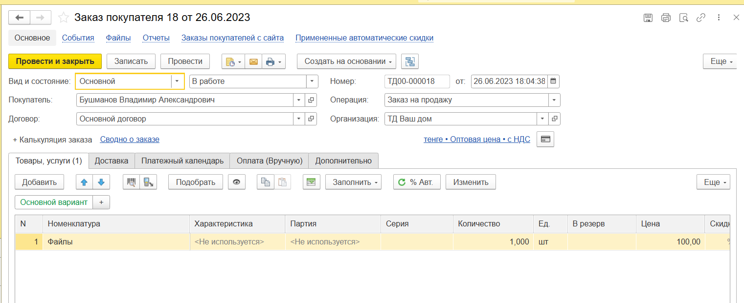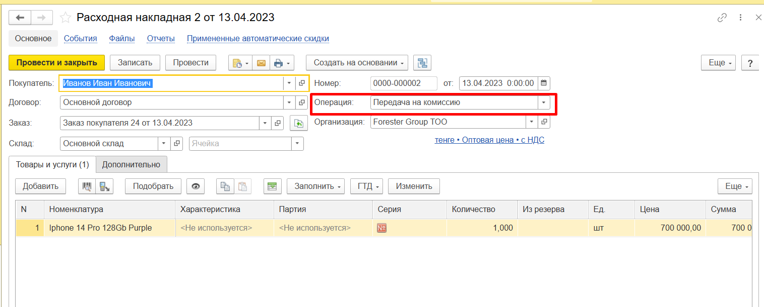 3. Оптовые продажи товаров в 1С: УНФ для Казахстана