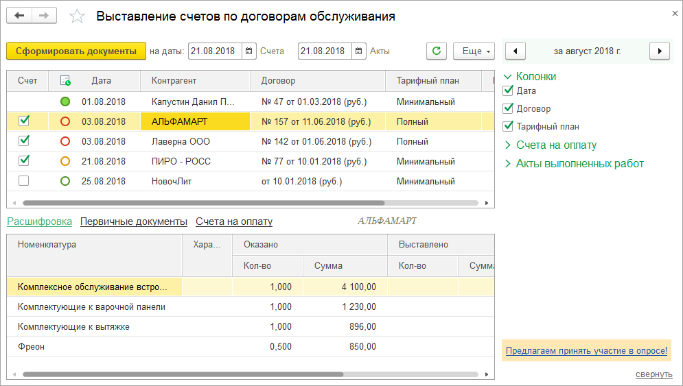 На основании данных договоров с помощью пакетной обработки можно создавать счеты на оплату и актов выполненных работ. Документы можно отправить по почте.