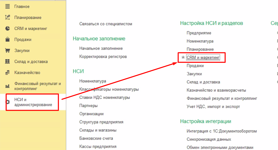 Для работы с функционалом нужно включить функциональные опции 1С: