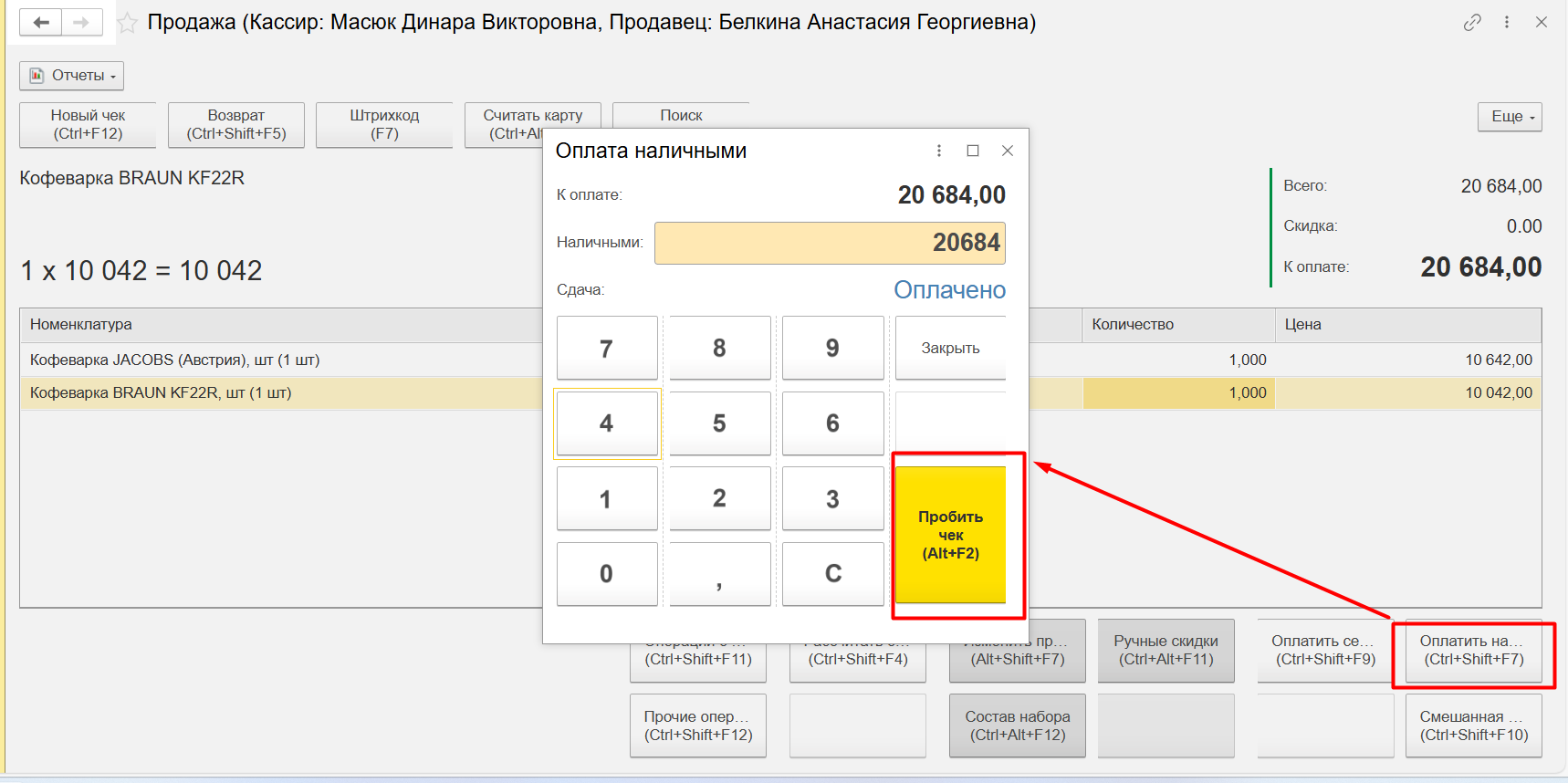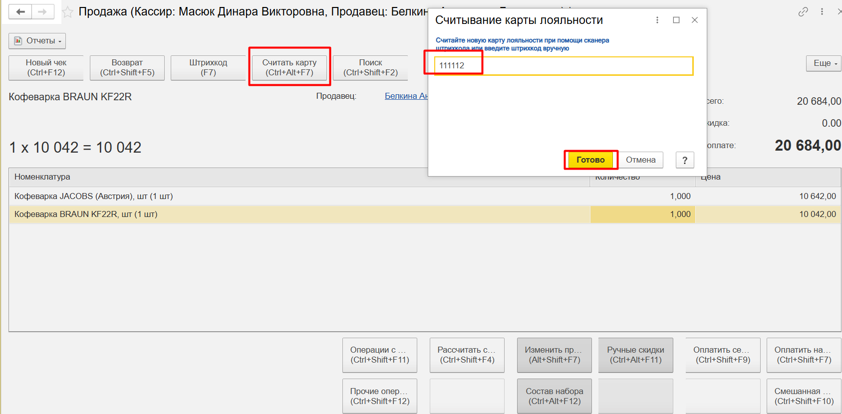 Бонусная программа 1С действует только в розничной торговле. Запускаем РМК кассира, подбираем товары, считываем бонусную карту и пробиваем чек. Подробнее о функционале розничной торговле рассмотрим в другой статье.