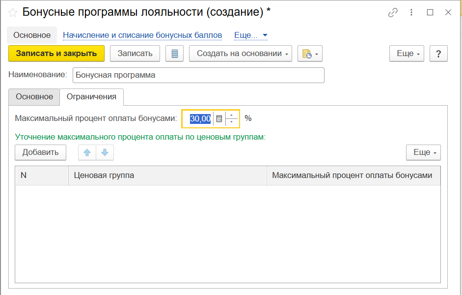 • Бонусная программа – используется для указания основных параметров учета бонусов.