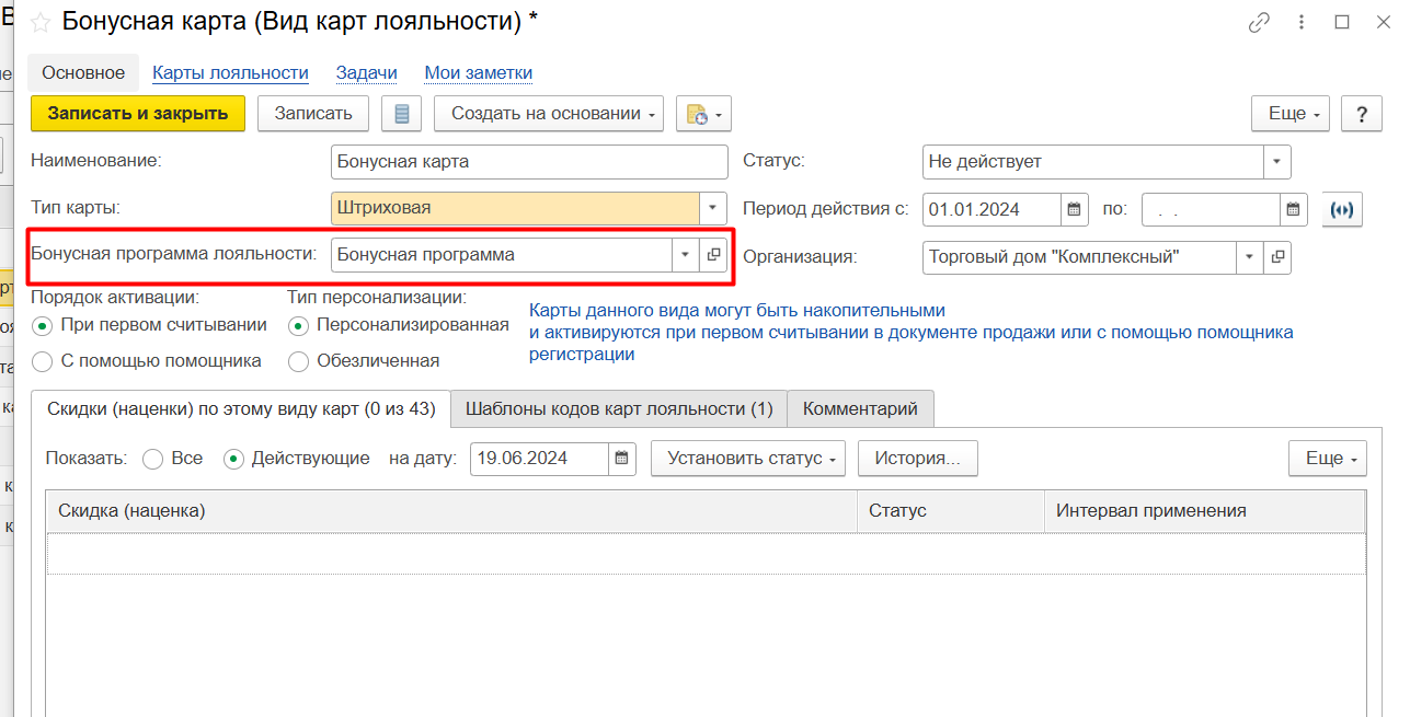 Далее переходим к настройке вида карт лояльности 1С. В предыдущей статье мы уже рассмотрели процесс создания вид карт, поэтому описывать процесс подробно не будем. Единственное отличие, необходимо указать бонусную программу 1С, которая была создана на предыдущем шаге. После создания вида карты создаем дисконтную карту 1С.