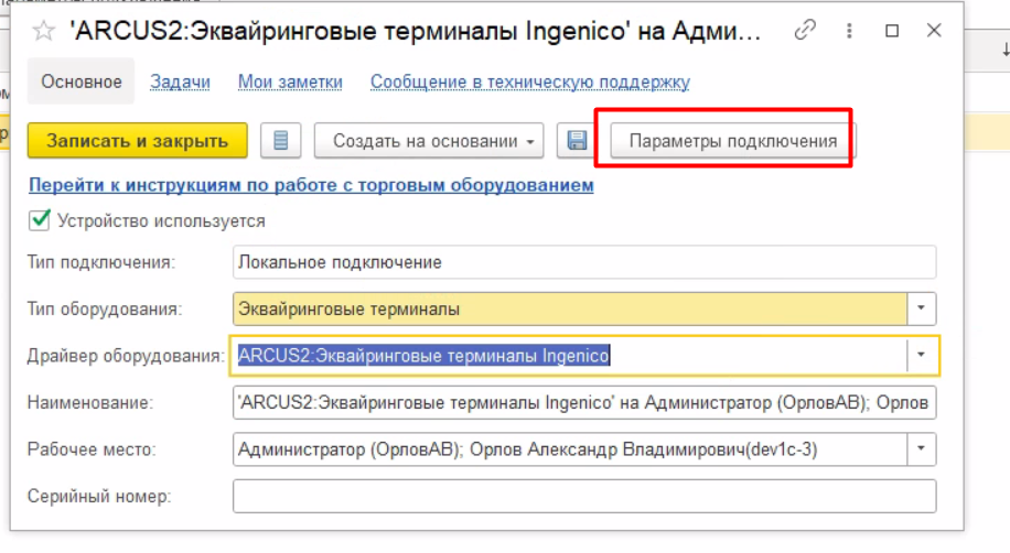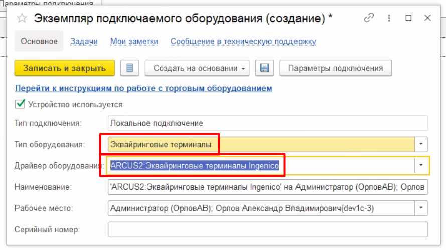 Выбираем соответствующий тип оборудования и указываем необходимый драйвер, который будем зависеть от поставляемого банком терминала. Сохраняем.