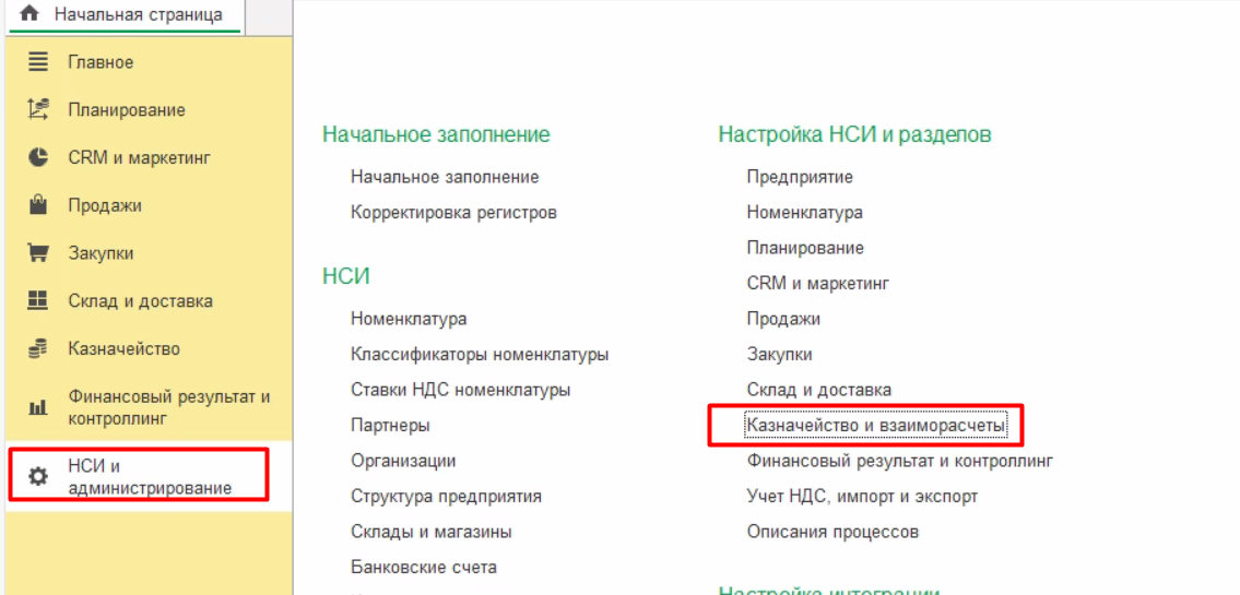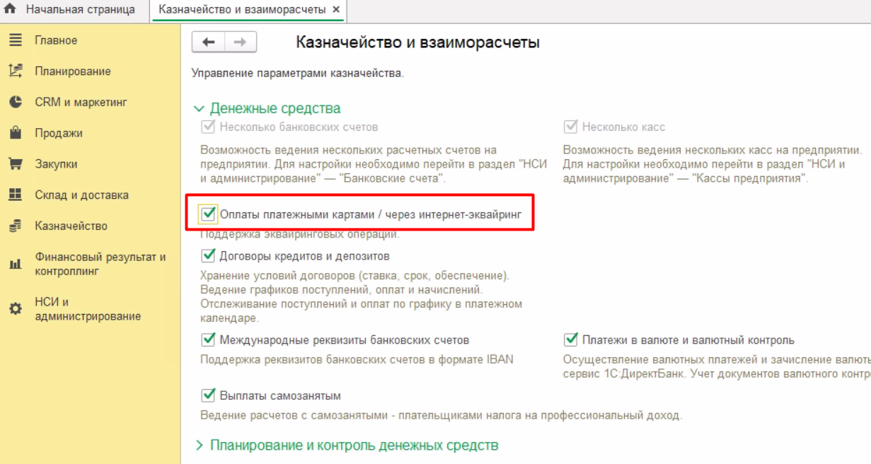 Для возможности использования приема платежей по платежным картам в 1С необходимо выполнить настройки. Переходим в общие настройки системы 1С и активируем соответствующую функциональную возможность.