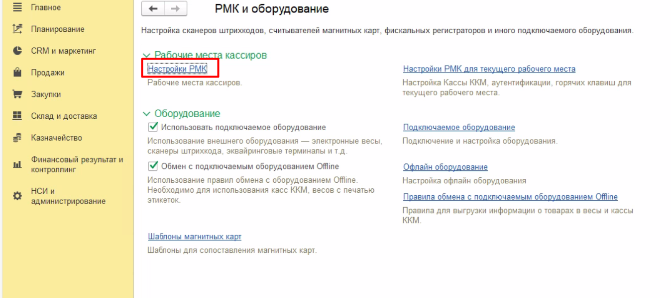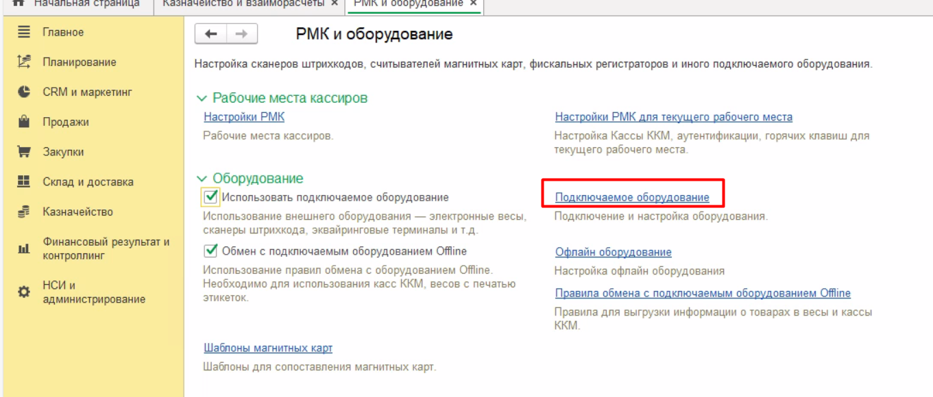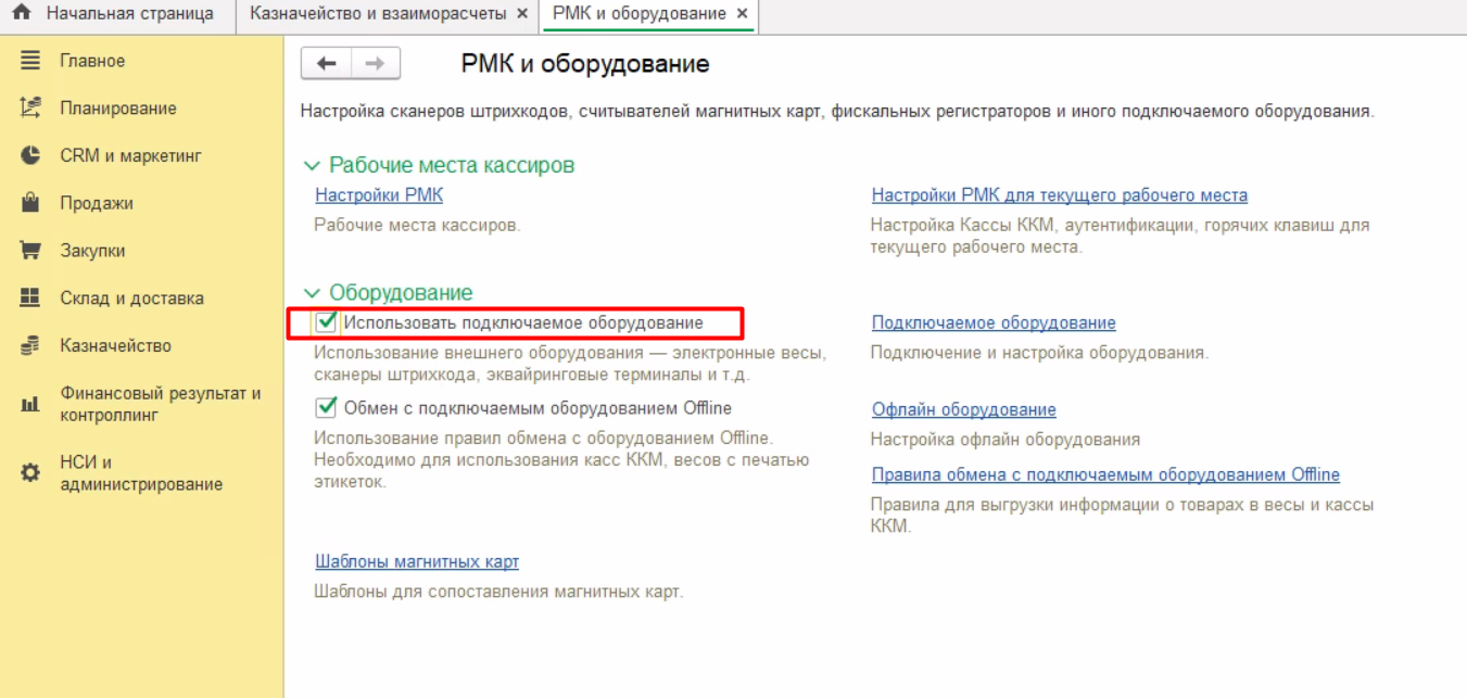 Далее необходимо включить использование подключаемого оборудования 1С.