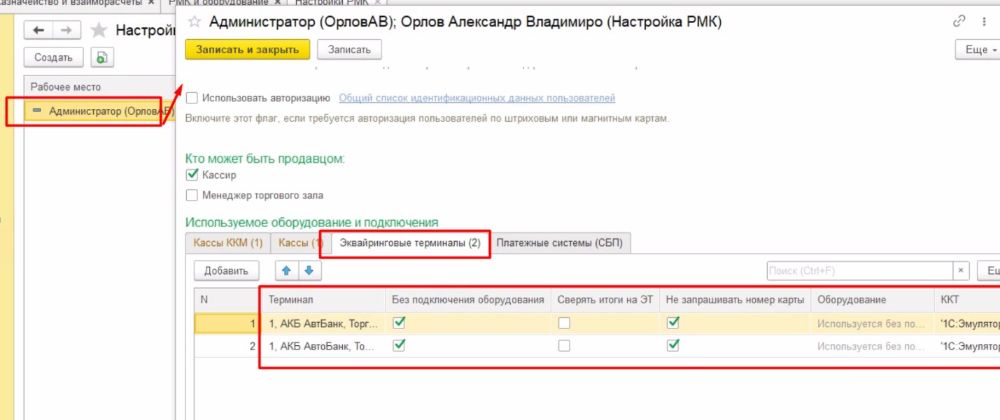 Открываем рабочее место и переходим на вкладку Эквайринговые терминалы и добавляем терминалы. Указываем созданное оборудование, а также оборудование ККТ. Тем самым эквайринг и ККМ будет связан.