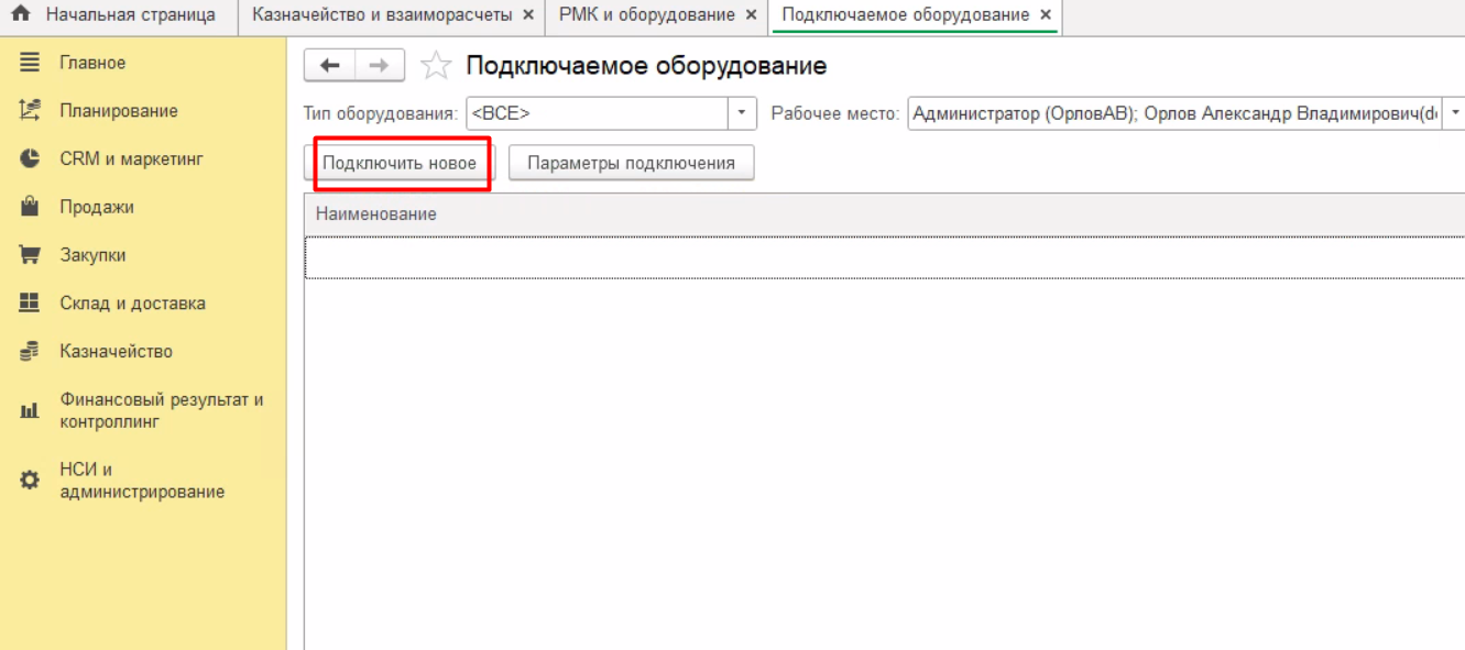 Теперь переходим непосредственно к созданию эквайринга. Если эквайринговый терминал будет подключен к компьютеру, то необходимо создать новое оборудование.