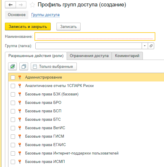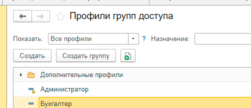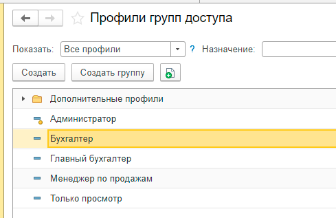Далее, перейдя на ссылку «Профили групп доступа» в подгруппе Группы доступа, можно увидеть, какие роли уже заведены в систему.