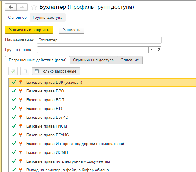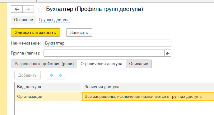 При необходимости, система программы 1С допускает настройку/изменение прав для группы. Выполняется это на складке «Ограничение доступа».