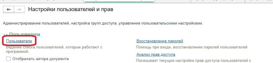 Для корректировки прав уже имеющегося пользователя (например, сотрудник перешел в другой отдел) или при устройстве на работу нового специалиста и заведения ему учетной записи, вы так же заходите в раздел «Настройки пользователей и прав». Выбираете ссылку «Пользователи».