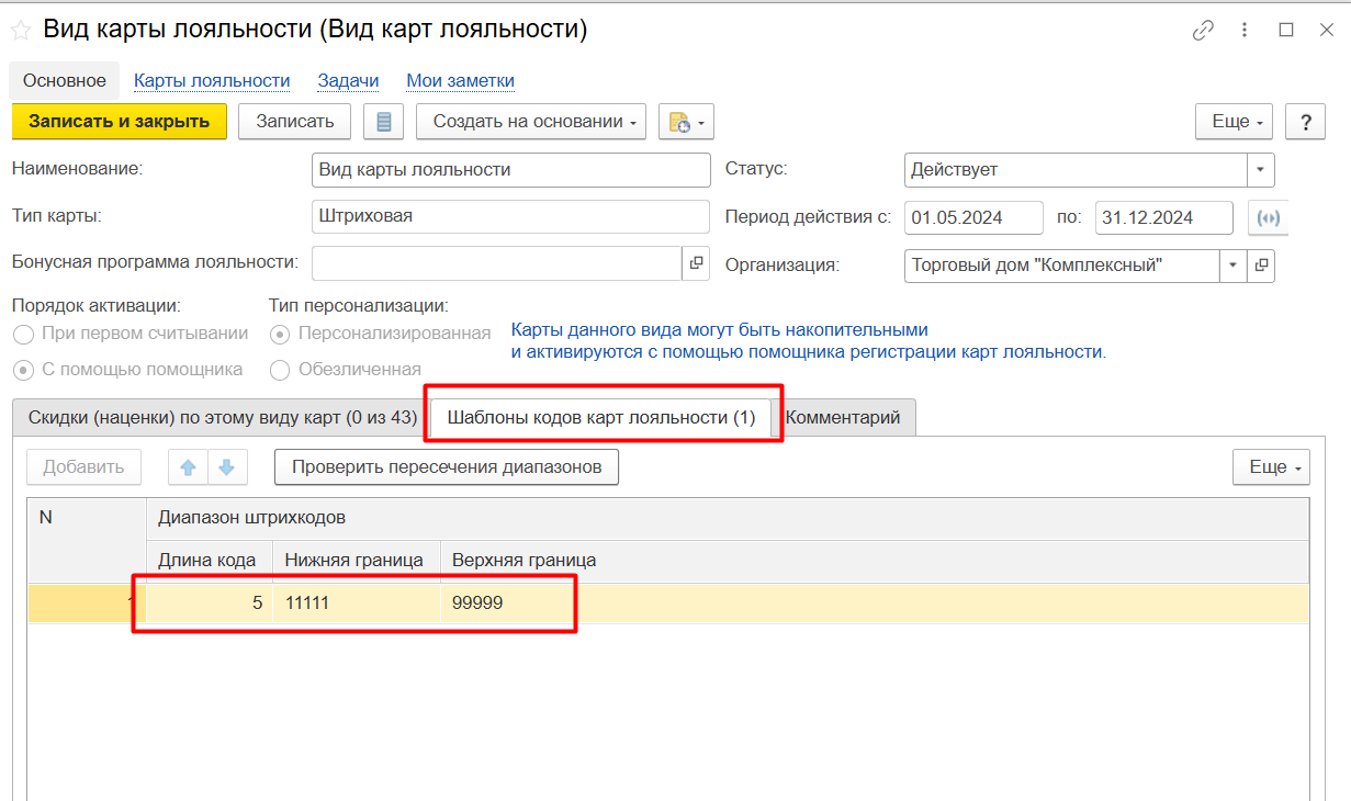 На следующей закладке настраиваем длину кода, а также границы диапазона штрихкода карт лояльности. Сохраняем новый вид.