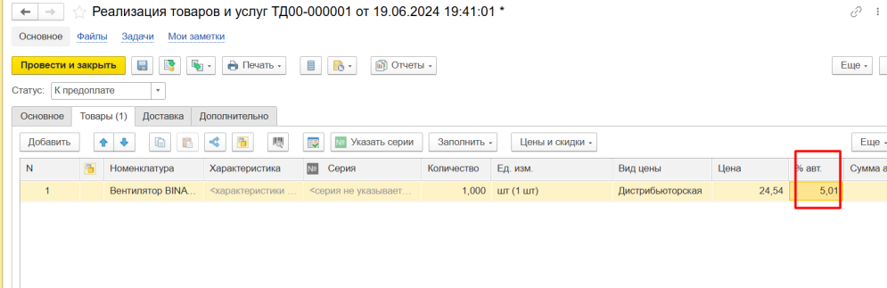 Проверяем табличную часть с товарами, процент скидки установился.