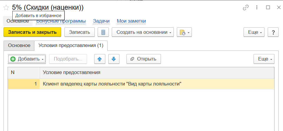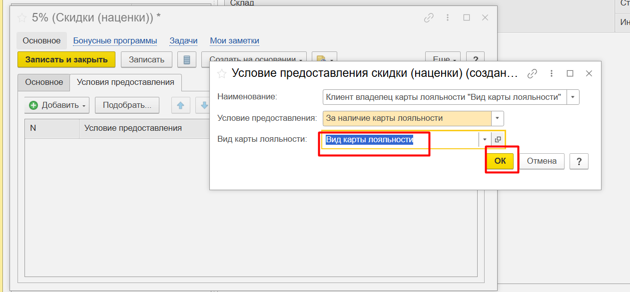 Выбираем условие – За наличие карты лояльности. Заполняем созданный вид карты , жмем ОК.