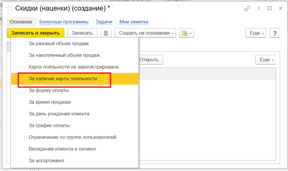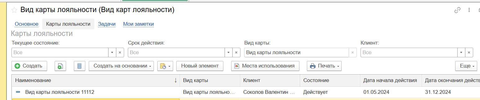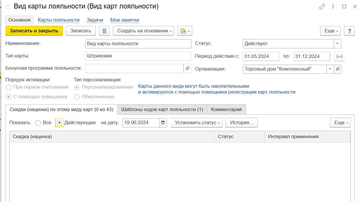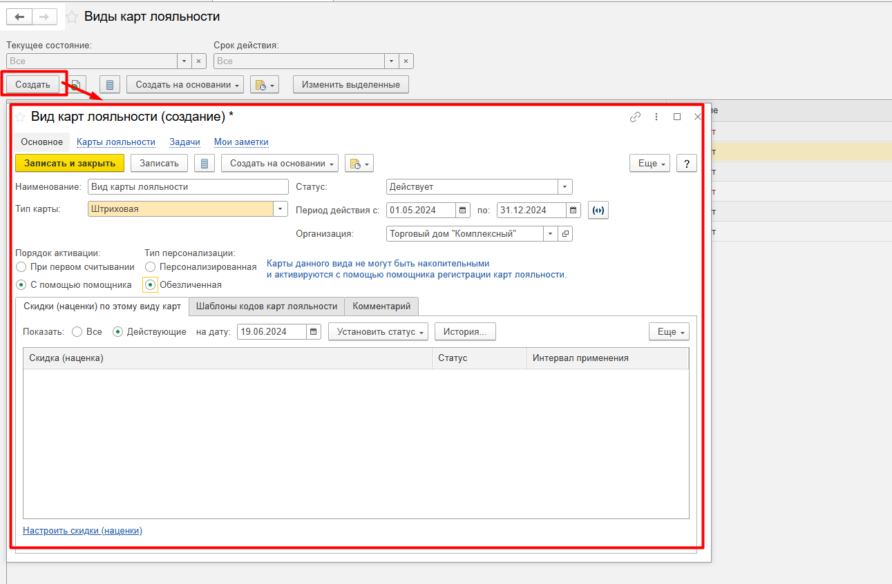 Вид карт лояльности (создание)