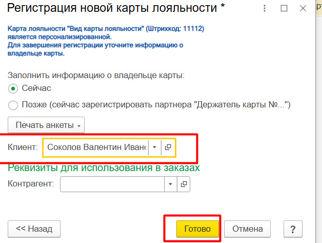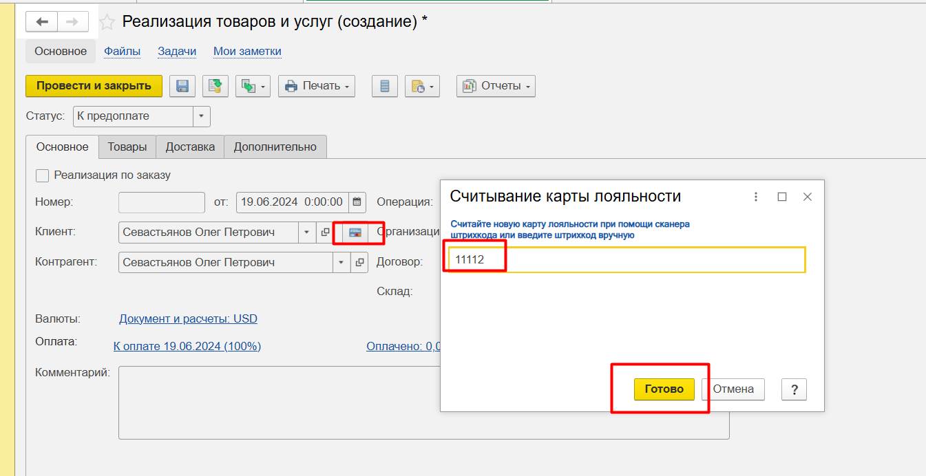 Создаем документ, заполняем данные клиента и список товаров. Далее сканируем штрих код карты лояльности (сканером или руками) в соответствующее поле ввода и жмем Готово. Выйдет сообщение с информацией о чтении карты лояльности.