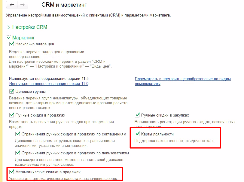 Далее включаем возможность использовать дисконтных карт. Также включаем возможность использования автоматических скидок. Так как предоставление скидок по картам настраиваются через автоматические скидки.