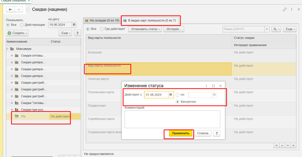 Далее необходимо указать получателя скидки. Открываем список скидок и устанавливаем статус Действует по кнопке для нашего вида карт лояльности. Применяем.