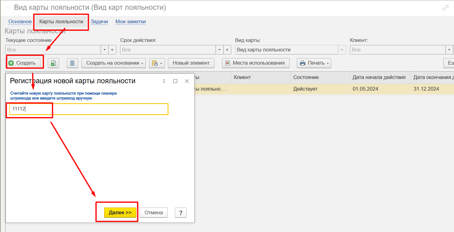 Далее переходим по гиперссылке Карты лояльности. Создаем новую дисконтную карту, сканируем или в ручную вводим штрихкод карты и жмем Далее.