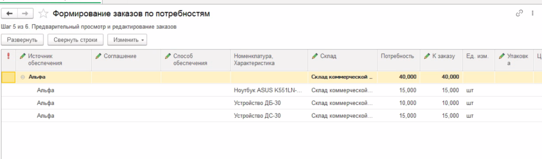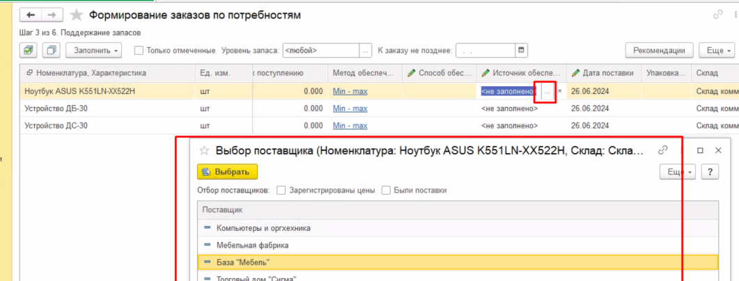 Указываем поставщика в колонке Источник обеспечения, можно указать разных поставщиков. Для автоматической подстановки поставщиков необходимо настроить способы обеспечения товаров. Но это мы рассмотрим в другой статье.