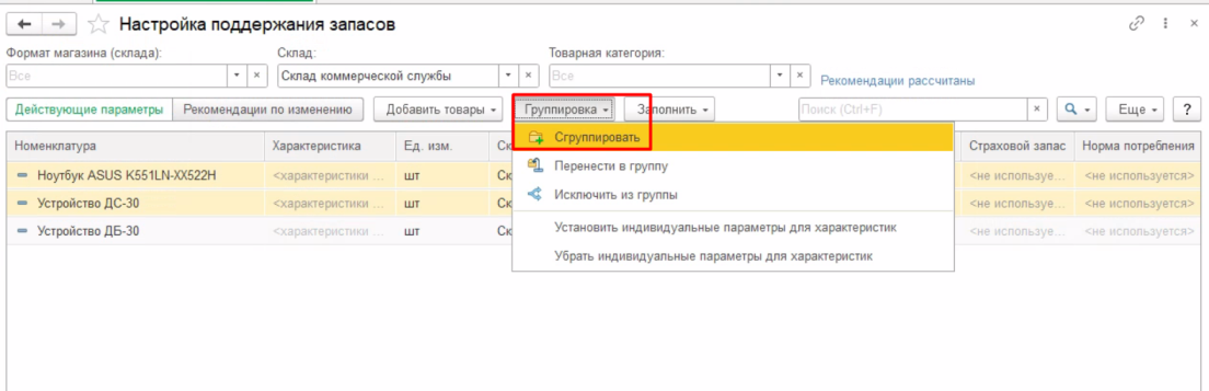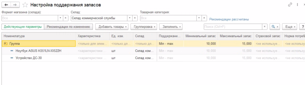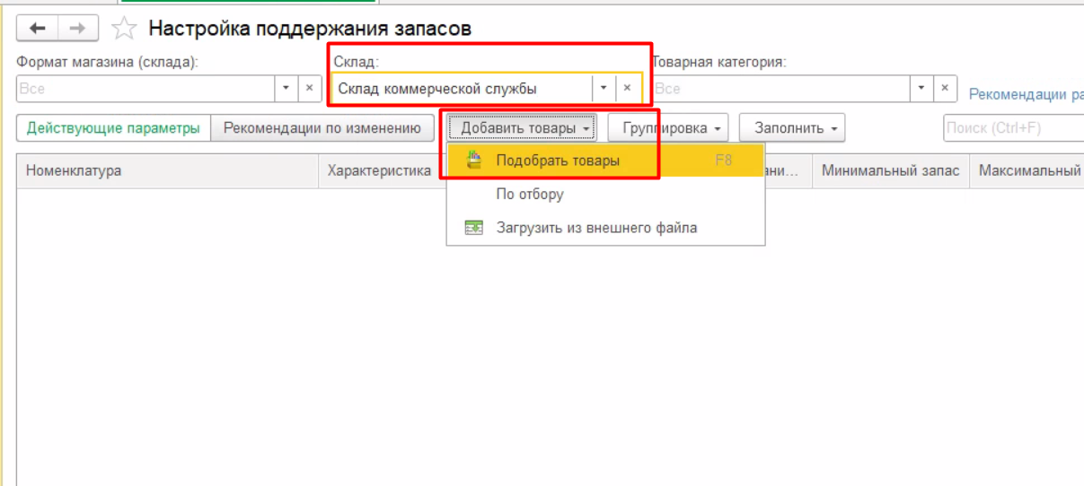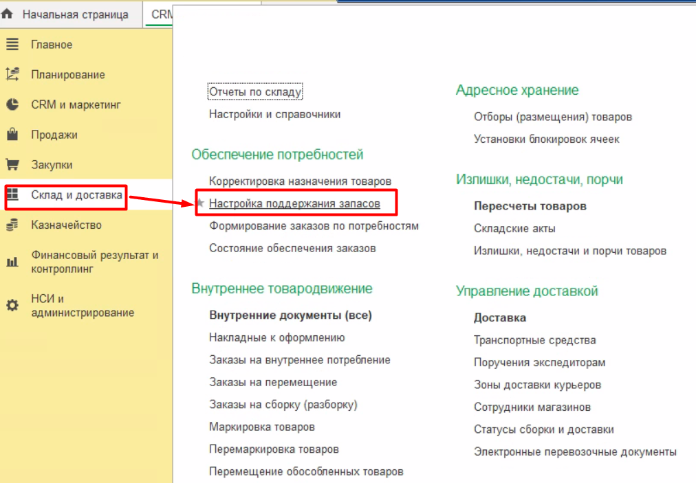 Открываем настройку поддержания запасов в складской подсистеме. Указываем склад, так как настройка выполняется в разрезе складов.