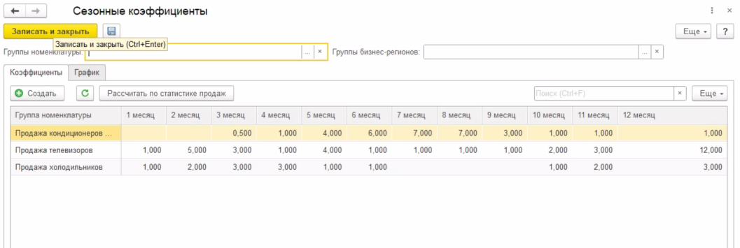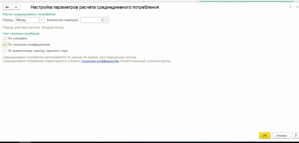 Здесь можно настроить параметры период и глубину анализа среднедневного потребления. Также можно настроить учет сезонный коэффициентов при расчете потребления. Сезонные коэффициенты настраиваются для более гибкого заказа товара, используется особенно, при высоком уровне сезонки.