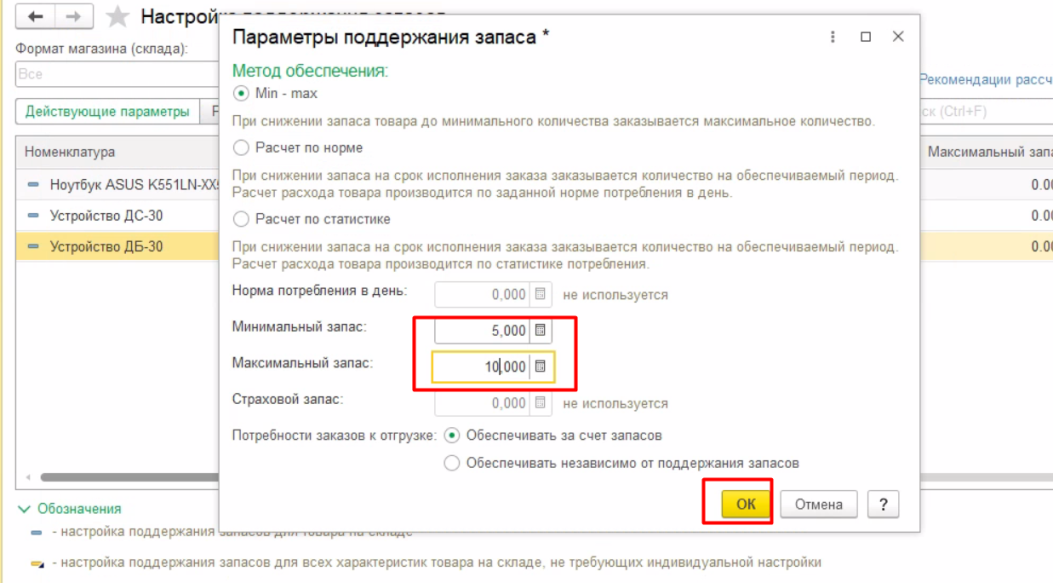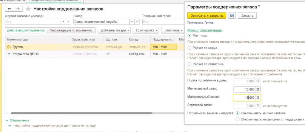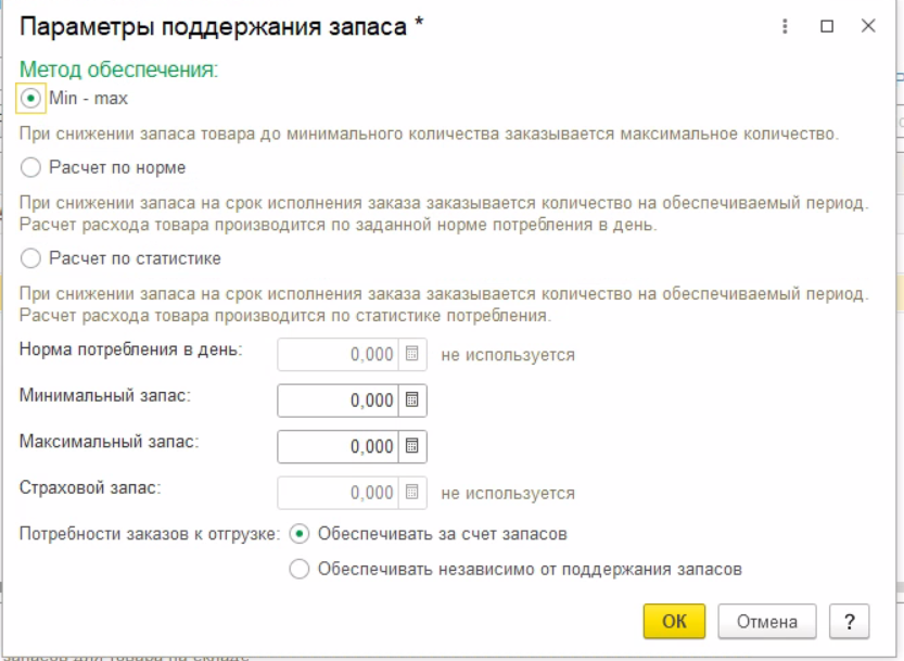 • Min-max – в данном методе вручную указывается мин и макс остатки. При снижении остатка до мин количества заказывается макс остаток;