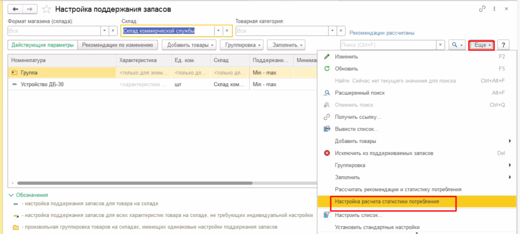 Для метода Расчет по статистике есть дополнительный настройки, которые открываются по кнопкам Еще –> Настройка расчета статистики потребления.