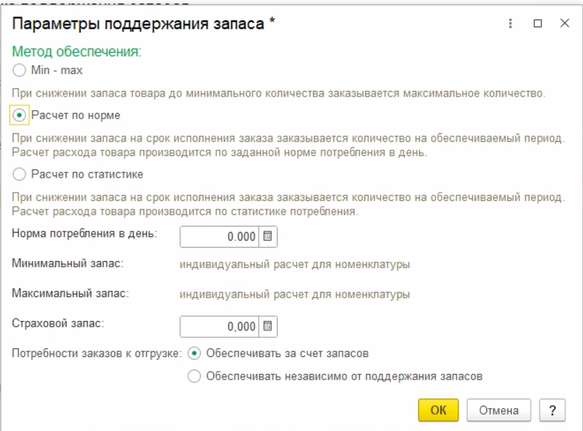 • Расчет по норме – В данном методе также вручную необходимо указать норму потребления товара в день, при необходимости указывается страховой запас, который закупается на всякий случай;