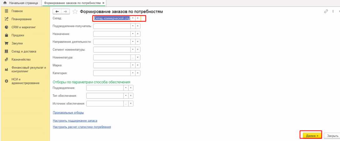 Теперь продемонстрируем процесс автоматического формирования заказов поставщику. Открываем обработку формирования заказов и указываем отбор по складу, по которому была выполнена настройка поддержания запасов. Жмем Далее.