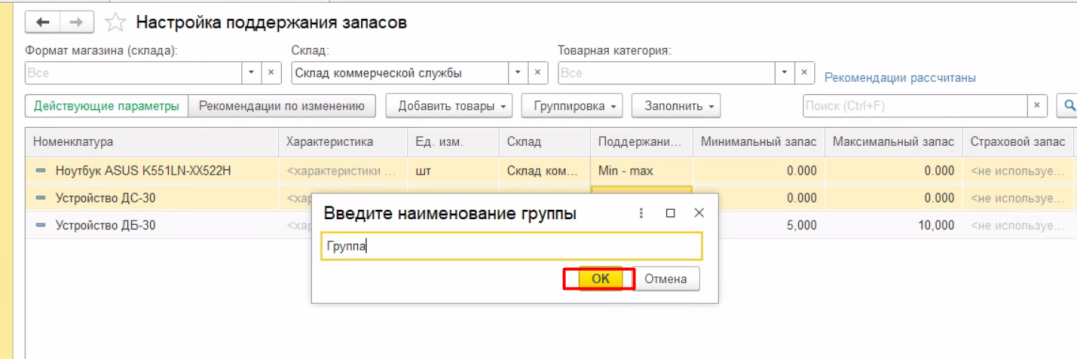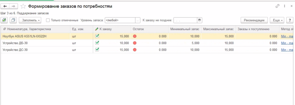 2. Демонстрация работы функционала поддержания запасов в 1С: УТ 3