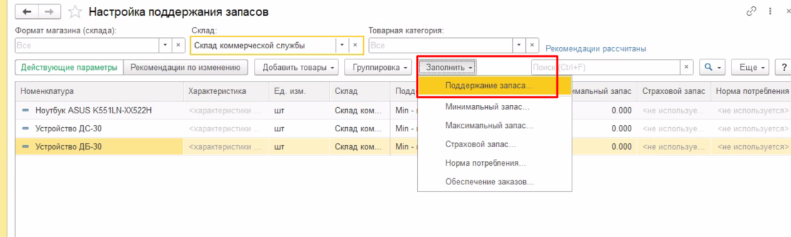 По кнопке Заполнить –> Поддержание запасов открываем настройки.