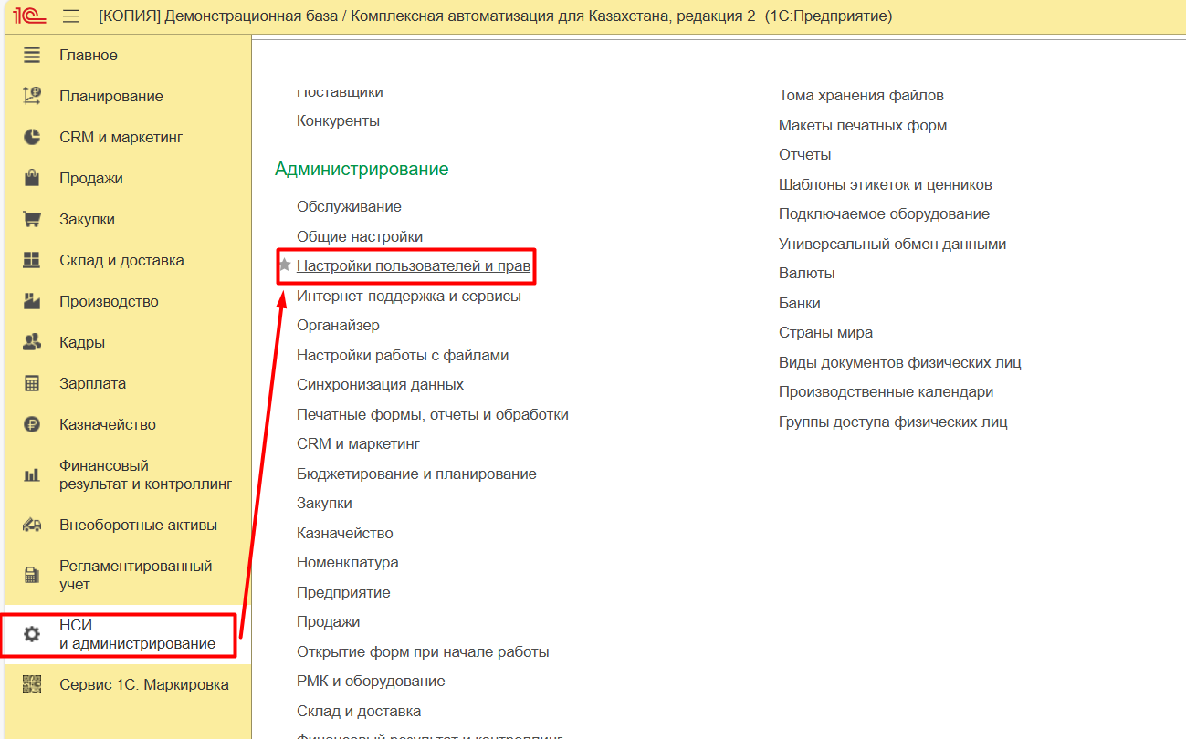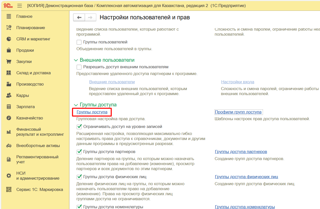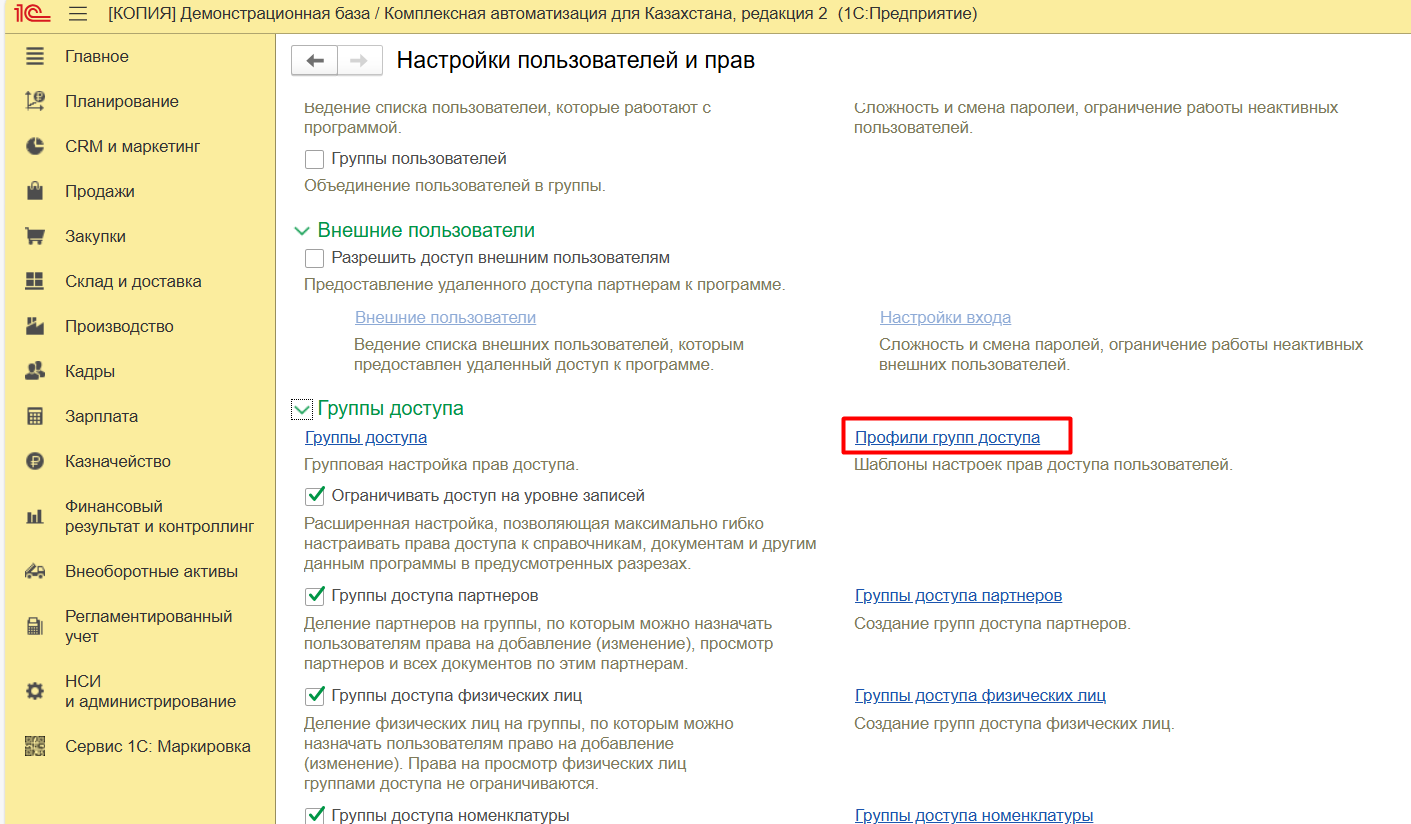 2. Настройка прав доступа в 1С: КА для Казахстана