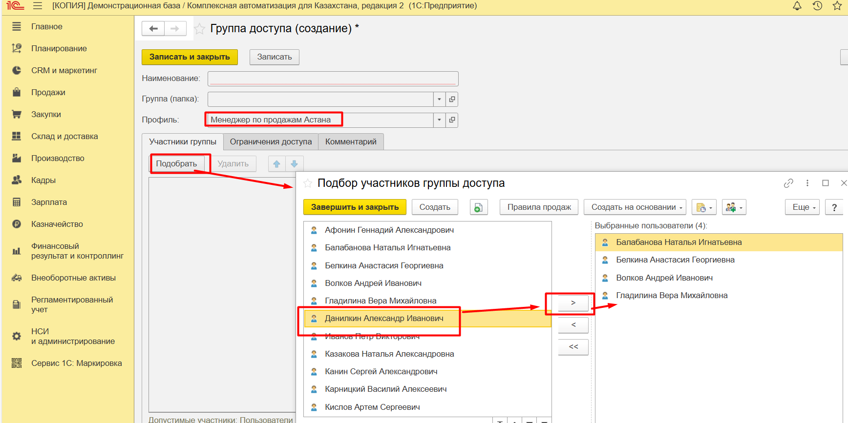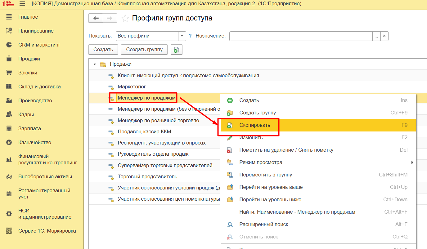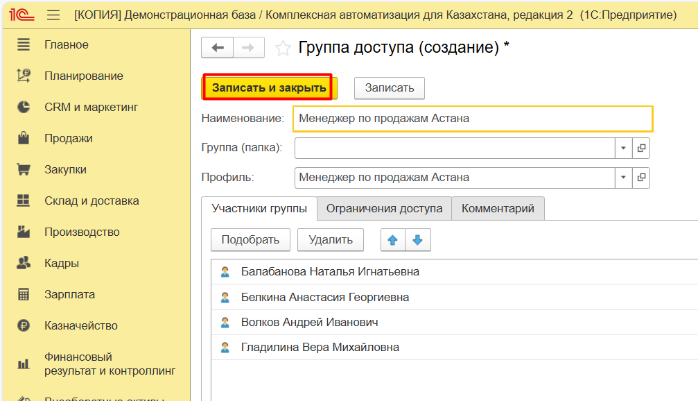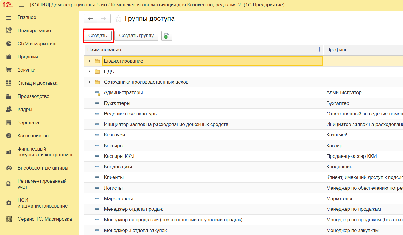 2. Настройка прав доступа в 1С: КА для Казахстана