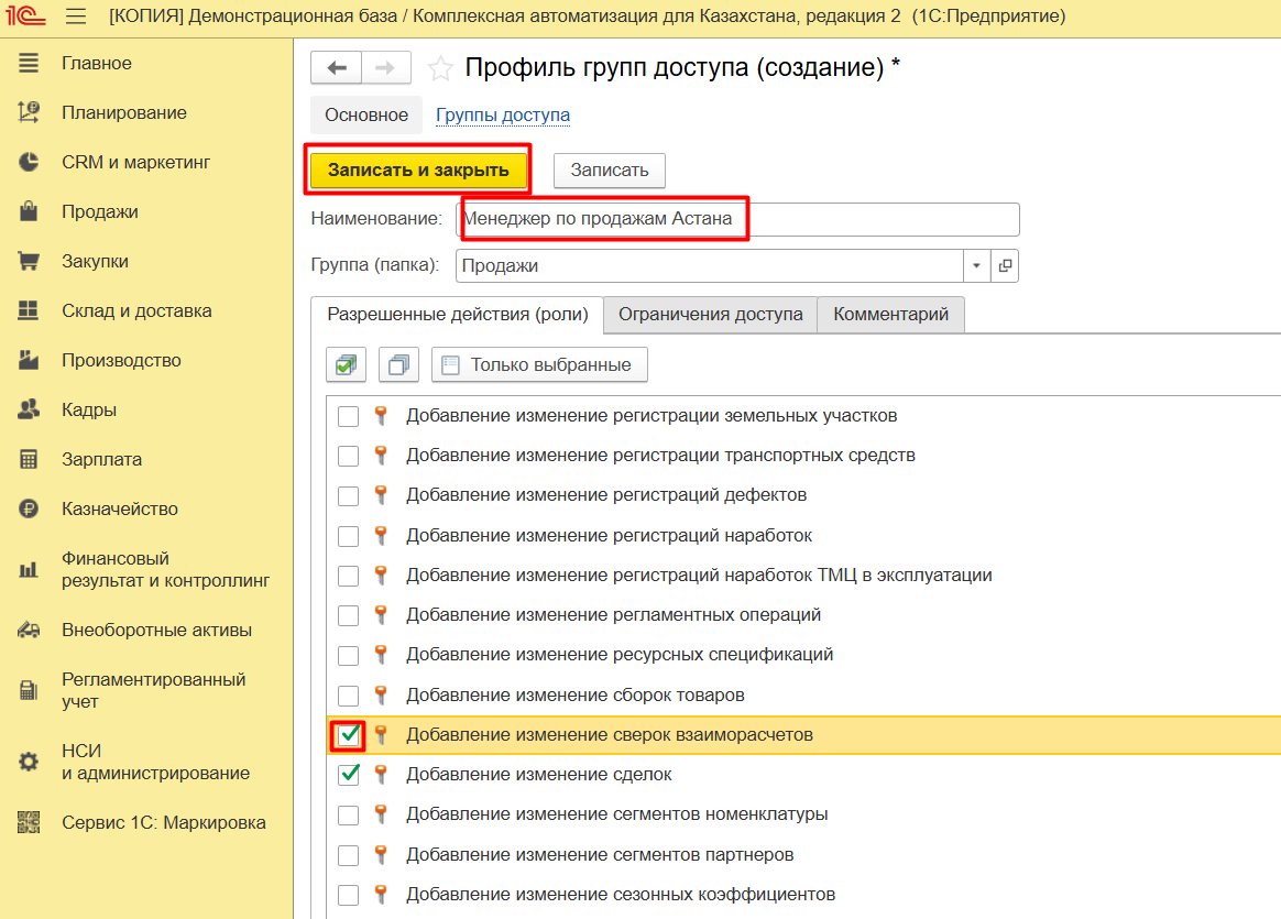 Указываем необходимые изменения. Например, менеджеры по продажам в Астане помимо основных обязанностей должны создавать сверки взаиморасчетов в 1С, находим и включаем соответствующую роль.