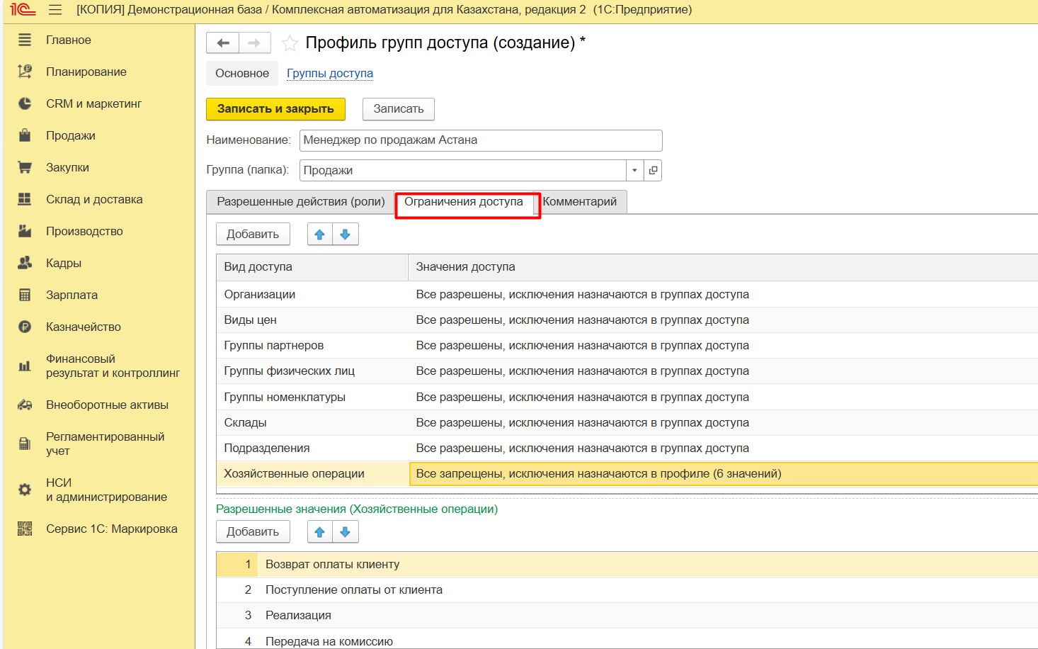 На вкладке Ограничения доступа 1С можно настроить, например, доступность той или иной организации, видов цен, хоз. Операций и т.д. То есть можно настроить доступы не только к объектам, но и к записям основной справочной информации. Сохраняем профиль.