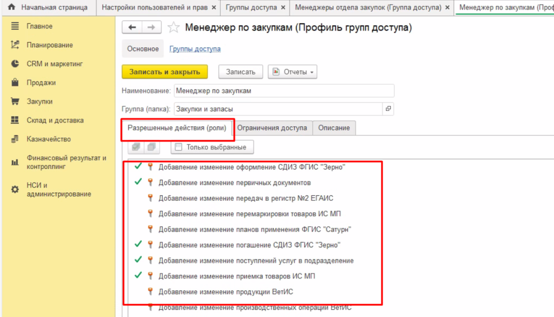 1. Роли. Роли представляют собой минимальной единицей в настройке прав, которые дают доступ к конечным объектам. Например: "Добавление изменение номенклатуры», «Чтение номенклатуры» и т.д.