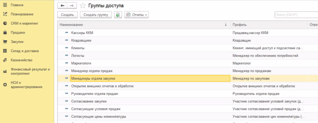 2. Профили группы доступа. Профили группы доступа представляют собой наборы ролей доступа, которые можно присваивать группам доступа. Например, можно создать профили: "Менеджер по продажам", "Складской работник", "Бухгалтер" и т.д.