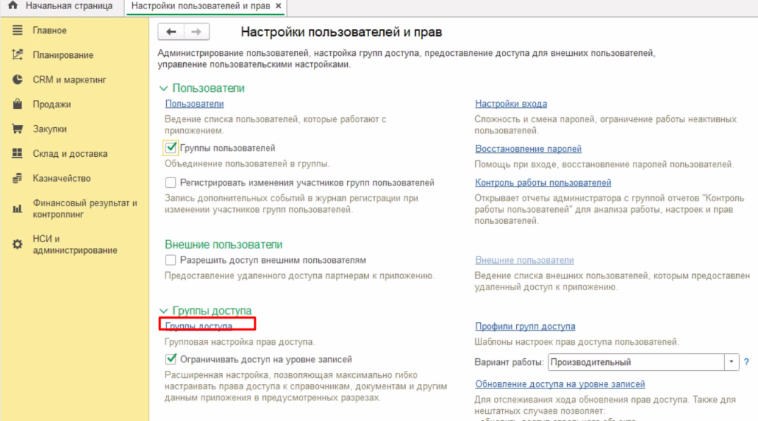 Помимо основной настройки прав в программе есть возможность ограничения доступа по записям. Например, в программе есть список складов, можно настроить права так, чтобы тот или иной склад был недоступен тому или иному пользователю. Данная настройка также выполняется в группе или профиле доступа, при включенной соответствующей опции.