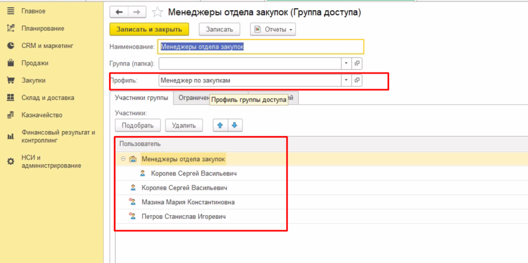 В группе доступа заполняется наименование (рекомендуется прописывать наименование, по которому будет понятно, какой набор ролей присвоен пользователю), профиль группы доступа, который содержит в себе набор ролей доступа, а также пользователь, которому будут присвоен данный набор ролей.