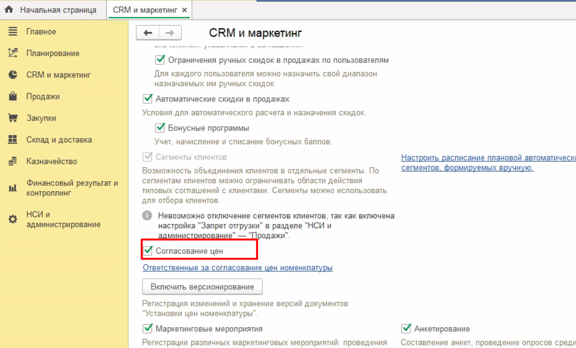 Для возможности согласования установки цен в настройках необходимо активировать соответствующую функциональную опцию. Данная возможность используется, для того, чтобы, например, руководитель мог проверять и согласовывать установленные цены.